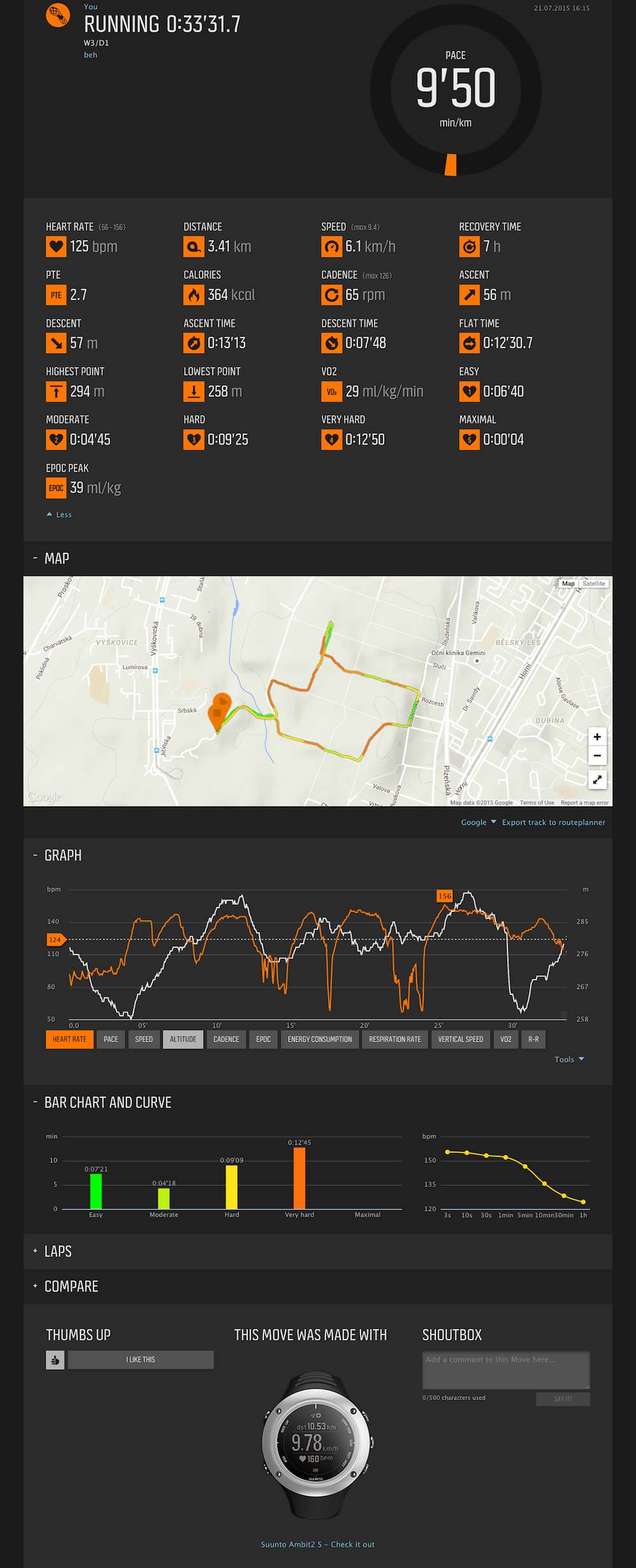 Dnes jsem použil Suunto hrudní pás, tep jsem tedy snímal pouze pomocí Ambitů, trasu a ostatní hodnoty, také pomocí mobilu a Endomonda. Nevím kolikrát to tak ještě budu absolvovat, je to poněkud otravné. Fakt je, že až budu zapínat pouze Ambity, tak tréninky budu muset do Endomonda importovat. Snad to bude alespoň trochu přesné. Vypadá to, že Ambity měří s originálním hrudním pásem přesněji.